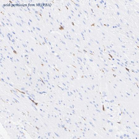 Immunohistochemical analysis of paraffin-embedded human gastrointestinal stromal tumor tissue with Rabbit anti-TMEM16A antibody (HA722719) at 1/2,000 dilution. The section was pre-treated using heat mediated antigen retrieval with Tris-EDTA buffer (pH 9.0) for 20 minutes. The tissues were blocked in 1% BSA for 20 minutes at room temperature, washed with ddH2O and PBS, and then probed with the primary antibody (HA722719) at 1/2,000 dilution for 1 hour at room temperature. The detection was performed using an HRP conjugated compact polymer system. DAB was used as the chromogen. Tissues were counterstained with hematoxylin and mounted with DPX.