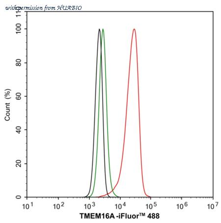 Flow cytometric analysis of HT-29 cells labeling TMEM16A. Cells were fixed and permeabilized. Then stained with the primary antibody (HA722720, 1μg/mL) (red) compared with Rabbit IgG Isotype Control (green). After incubation of the primary antibody at +4℃ for an hour, the cells were stained with a iFluor™ 488 conjugate-Goat anti-Rabbit IgG Secondary antibody (HA1121) at 1/1,000 dilution for 30 minutes at +4℃. Unlabelled sample was used as a control (cells without incubation with primary antibody; black).