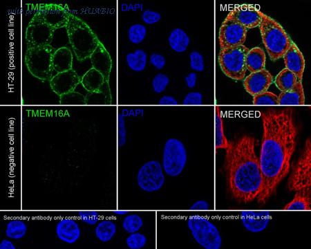 Immunocytochemistry analysis of HT-29 (positive) and HeLa (negative) labeling TMEM16A with Rabbit anti-TMEM16A antibody (HA751085) at 1/100 dilution. Cells were fixed in 4% paraformaldehyde for 20 minutes at room temperature, permeabilized with 0.1% Triton X-100 in PBS for 5 minutes at room temperature, then blocked with 1% BSA in 10% negative goat serum for 1 hour at room temperature. Cells were then incubated with Rabbit anti-TMEM16A antibody (HA751085) at 1/100 dilution in 1% BSA in PBST overnight at 4 ℃. Goat Anti-Rabbit IgG H&L (iFluor™ 488, HA1121) was used as the secondary antibody at 1/1,000 dilution. PBS instead of the primary antibody was used as the secondary antibody only control. Nuclear DNA was labelled in blue with DAPI. Beta tubulin (M1305-2, red) was stained at 1/100 dilution overnight at +4℃. Goat Anti-Mouse IgG H&L (iFluor™ 594, HA1126) was used as the secondary antibody at 1/1,000 dilution.