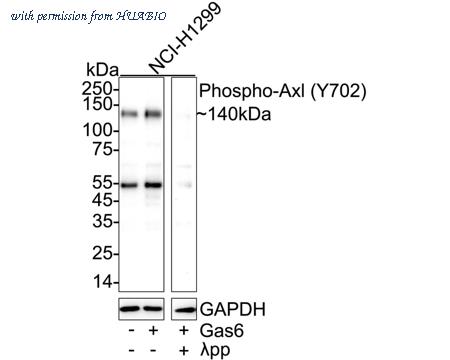 Western blot analysis of Phospho-Axl (Y702) on different lysates with Rabbit anti-Phospho-Axl (Y702) antibody (HA723963) at 1/5,000 dilution. Lane 1: NCI-H1299 cell lysate Lane 2: NCI-H1299 treated with 100ng/mL Gas6 for 10 minutes cell lysate Lane 3: NCI-H1299 treated with 100ng/mL Gas6 for 10 minutes cell lysate, then the membrane treated with λpp for 1 hour Lysates/proteins at 20 µg/Lane. Predicted band size: 98 kDa Observed band size: 140 kDa Exposure time: 3 minutes; ECL: K1802; 4-20% SDS-PAGE gel. Proteins were transferred to a PVDF membrane and blocked with 5% NFDM/TBST for 1 hour at room temperature. The primary antibody (HA723963) at 1/5,000 dilution was used in primary antibody dilution (K1803) at 4℃ overnight. Goat Anti-Rabbit IgG - HRP Secondary Antibody (HA1001) at 1/50,000 dilution was used for 1 hour at room temperature.