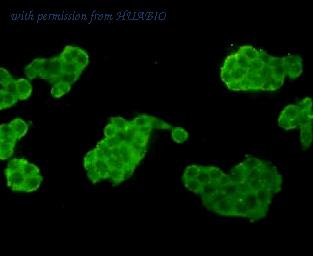 Immunocytochemistry analysis of NCI-H1299 (positive) and Jurkat (negative) labeling Axl with Rabbit anti-Axl antibody (HA751097) at 1/100 dilution. Cells were fixed in 4% paraformaldehyde for 20 minutes at room temperature, permeabilized with 0.1% Triton X-100 in PBS for 5 minutes at room temperature, then blocked with 1% BSA in 10% negative goat serum for 1 hour at room temperature. Cells were then incubated with Rabbit anti-Axl antibody (HA751097) at 1/100 dilution in 1% BSA in PBST overnight at 4 ℃. Goat Anti-Rabbit IgG H&L (iFluor™ 488, HA1121) was used as the secondary antibody at 1/1,000 dilution. PBS instead of the primary antibody was used as the secondary antibody only control. Nuclear DNA was labelled in blue with DAPI. Beta tubulin (M1305-2, red) was stained at 1/100 dilution overnight at +4℃. Goat Anti-Mouse IgG H&L (iFluor™ 594, HA1126) was used as the secondary antibody at 1/1,000 dilution.