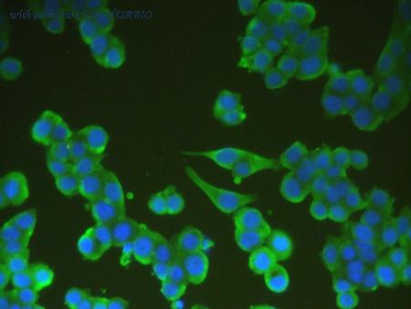 ICC staining UFO (green) in SW480 cells. The nuclear counter stain is DAPI (blue). Cells were fixed in paraformaldehyde, permeabilised with 0.25% Triton X100/PBS.