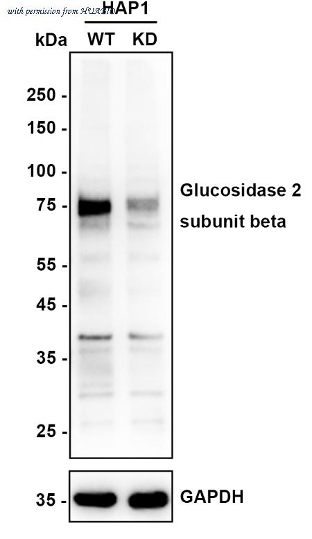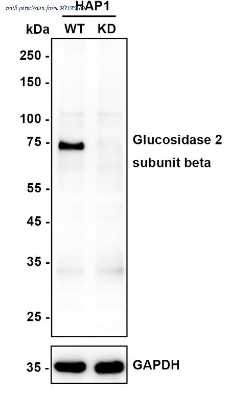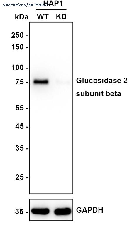 Western blot analysis of Glucosidase 2 subunit beta on different lysates with Rabbit anti-Glucosidase 2 subunit beta antibody (HA500152) at 1/2,000 dilution. Lane 1: HAP1-parental cell lysate Lane 2: HAP1-Glucosidase 2 subunit beta KD cell lysate Lysates/proteins at 10 µg/Lane. Predicted band size: 59 kDa Observed band size: 75 kDa Exposure time: 6 seconds; ECL: K1801; 4-20% SDS-PAGE gel. Proteins were transferred to a PVDF membrane and blocked with 5% NFDM/TBST for 1 hour at room temperature. The primary antibody (HA500152) at 1/2,000 dilution was used in primary antibody dilution (K1803) at 4℃ overnight. Goat Anti-Rabbit IgG - HRP Secondary Antibody (HA1001) at 1/50,000 dilution was used for 1 hour at room temperature.