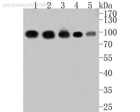 Western blot analysis of Glucosidase 2 subunit beta on different lysates with Mouse anti-Glucosidase 2 subunit beta antibody (HA610151) at 1/1,000 dilution. Lane 1: HeLa cell lysate Lane 2: 293T cell lysate Lane 3: Daudi cell lysate Lane 4: Jurkat cell lysate Lane 5: A431 cell lysate Lysates/proteins at 20 µg/Lane. Predicted band size: 59 kDa Observed band size: 80 kDa Exposure time: 5 minutes; 4-20% SDS-PAGE gel. Proteins were transferred to a PVDF membrane and blocked with 5% NFDM/TBST for 1 hour at room temperature. The primary antibody (HA610151) at 1/1,000 dilution was used in 5% NFDM/TBST at 4℃ overnight. Goat Anti-Mouse IgG - HRP Secondary Antibody (HA1006) at 1/50,000 dilution was used for 1 hour at room temperature.