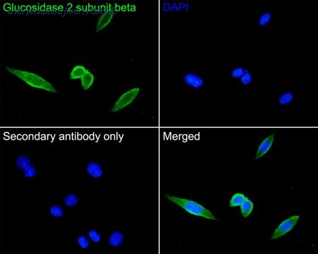 Immunocytochemistry analysis of SiHa cells labeling Glucosidase 2 subunit beta with Rabbit anti-Glucosidase 2 subunit beta antibody (HA500152) at 1/200 dilution. Cells were fixed in 4% paraformaldehyde for 10 minutes at 37 ℃, permeabilized with 0.05% Triton X-100 in PBS for 20 minutes, and then blocked with 2% negative goat serum for 30 minutes at room temperature. Cells were then incubated with Rabbit anti-Glucosidase 2 subunit beta antibody (HA500152) at 1/200 dilution in 2% negative goat serum overnight at 4 ℃. Goat Anti-Rabbit IgG H&L (iFluor™ 488, HA1121) was used as the secondary antibody at 1/1,000 dilution. PBS instead of the primary antibody was used as the secondary antibody only control. Nuclear DNA was labelled in blue with DAPI.
