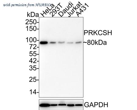 Western blot analysis of Glucosidase 2 subunit beta on different lysates with Mouse anti-Glucosidase 2 subunit beta antibody (HA600054) at 1/1,000 dilution. Lane 1: HeLa cell lysate Lane 2: 293T cell lysate Lane 3: Daudi cell lysate Lane 4: Jurkat cell lysate Lane 5: A431 cell lysate Lysates/proteins at 20 µg/Lane. Predicted band size: 59 kDa Observed band size: 80 kDa Exposure time: 5 minutes; 4-20% SDS-PAGE gel. Proteins were transferred to a PVDF membrane and blocked with 5% NFDM/TBST for 1 hour at room temperature. The primary antibody (HA600054) at 1/1,000 dilution was used in 5% NFDM/TBST at 4℃ overnight. Goat Anti-Mouse IgG - HRP Secondary Antibody (HA1006) at 1/50,000 dilution was used for 1 hour at room temperature.