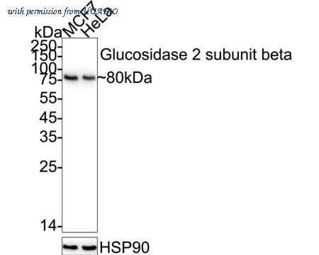 Western blot analysis of Glucosidase 2 subunit beta on different lysates with Rabbit anti-Glucosidase 2 subunit beta antibody (HA720042) at 1/2,000 dilution. Lane 1: MCF7 cell lysate Lane 2: HeLa cell lysate Lysates/proteins at 20 µg/Lane. Predicted band size: 59 kDa Observed band size: 80 kDa Exposure time: 4 seconds; ECL: K1801; 4-20% SDS-PAGE gel. Proteins were transferred to a PVDF membrane and blocked with 5% NFDM/TBST for 1 hour at room temperature. The primary antibody (HA720042) at 1/2,000 dilution was used in 5% NFDM/TBST at 4℃ overnight. Goat Anti-Rabbit IgG - HRP Secondary Antibody (HA1001) at 1/50,000 dilution was used for 1 hour at room temperature.