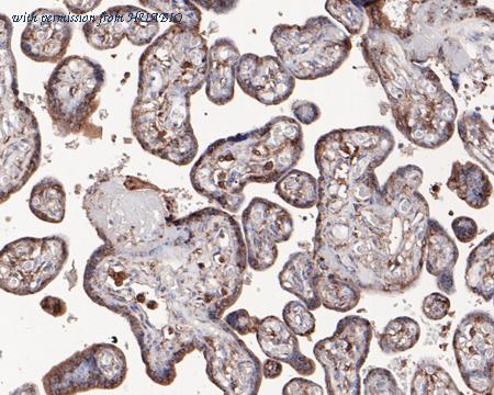 Immunohistochemical analysis of paraffin-embedded human placenta tissue using anti-Glucosidase 2 subunit beta antibody. The section was pre-treated using heat mediated antigen retrieval with Tris-EDTA buffer (pH 8.0-8.4) for 20 minutes.The tissues were blocked in 5% BSA for 30 minutes at room temperature, washed with ddH2O and PBS, and then probed with the primary antibody (HA720042, 1/50) for 30 minutes at room temperature. The detection was performed using an HRP conjugated compact polymer system. DAB was used as the chromogen. Tissues were counterstained with hematoxylin and mounted with DPX.