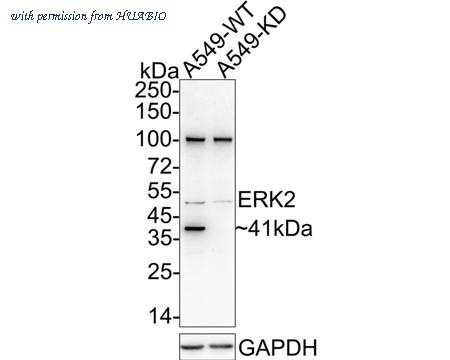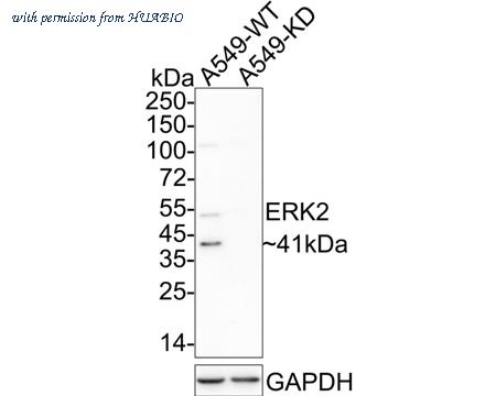 Western blot analysis of ERK2 on different lysates with Rabbit anti-ERK2 antibody (ER131218) at 1/2,000 dilution. Lane 1: A549-si NT cell lysate (10 µg/Lane) Lane 2: A549-si ERK2 cell lysate (10 µg/Lane) Predicted band size: 41 kDa Observed band size: 41 kDa Exposure time: 17 seconds; ECL: K1801; 4-20% SDS-PAGE gel. Proteins were transferred to a PVDF membrane and blocked with 5% NFDM/TBST for 1 hour at room temperature. The primary antibody (ER131218) at 1/2,000 dilution was used in 5% NFDM/TBST at room temperature for 2 hours. Goat Anti-Rabbit IgG - HRP Secondary Antibody (HA1001) at 1/50,000 dilution was used for 1 hour at room temperature.