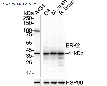 Western blot analysis of ERK2 on different lysates with Rabbit anti-ERK2 antibody (ER131218) at 1/5,000 dilution. Lane 1: A431 cell lysate (20 µg/Lane) Lane 2: C6 cell lysate (20 µg/Lane) Lane 3: Mouse brain tissue lysate (40 µg/Lane) Lane 4: Rat brain tissue lysate (40 µg/Lane) Predicted band size: 41 kDa Observed band size: 41 kDa Exposure time: 2 seconds; ECL: K1801; 4-20% SDS-PAGE gel. Proteins were transferred to a PVDF membrane and blocked with 5% NFDM/TBST for 1 hour at room temperature. The primary antibody (ER131218) at 1/5,000 dilution was used in primary antibody dilution (K1803) at 4℃ overnight. Goat Anti-Rabbit IgG - HRP Secondary Antibody (HA1001) at 1/50,000 dilution was used for 1 hour at room temperature.