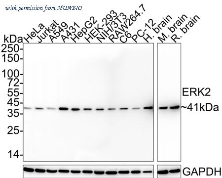 Western blot analysis of ERK2 on different lysates with Mouse anti-ERK2 antibody (HA601201) at 1/1,000 dilution. Lane 1: HeLa cell lysate (20 µg/Lane) Lane 2: Jurkat cell lysate (20 µg/Lane) Lane 3: A549 cell lysate (20 µg/Lane) Lane 4: A431 cell lysate (20 µg/Lane) Lane 5: HepG2 cell lysate (20 µg/Lane) Lane 6: HEK-293 cell lysate (20 µg/Lane) Lane 7: NIH/3T3 cell lysate (20 µg/Lane) Lane 8: RAW264.7 cell lysate (20 µg/Lane) Lane 9: C6 cell lysate (20 µg/Lane) Lane 10: Human brain tissue lysate (40 µg/Lane) Lane 11: Mouse brain tissue lysate (40 µg/Lane) Lane 12: Rat brain tissue lysate (40 µg/Lane) Predicted band size: 41 kDa Observed band size: 41 kDa Exposure time: 43 seconds; ECL: K1801; 4-20% SDS-PAGE gel. Proteins were transferred to a PVDF membrane and blocked with 5% NFDM/TBST for 1 hour at room temperature. The primary antibody (HA601201) at 1/1,000 dilution was used in 5% NFDM/TBST at 4℃ overnight. Alpaca Anti-Mouse IgG - HRP for IP Nano-Secondary Antibody (NBI02H) at 1/5,000 dilution was used for 1 hour at room temperature.