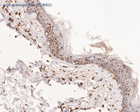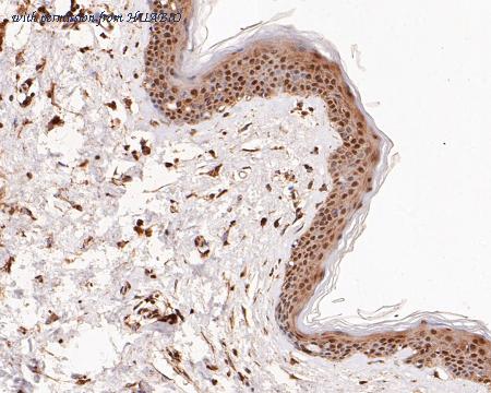 Immunohistochemical analysis of paraffin-embedded human skin tissue using anti-ERK2 antibody. The section was pre-treated using heat mediated antigen retrieval with sodium citrate buffer (pH 6.0) (high pressure) for 2 minutes. The tissues were blocked in 5% BSA for 30 minutes at room temperature, washed with ddH2O and PBS, and then probed with the primary antibody (EM1901-55, 1/100) for 30 minutes at room temperature. The detection was performed using an HRP conjugated compact polymer system. DAB was used as the chromogen. Tissues were counterstained with hematoxylin and mounted with DPX.