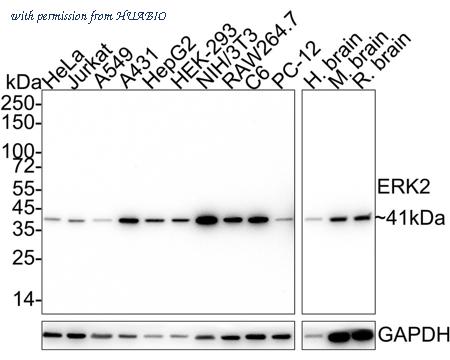 Western blot analysis of ERK1/2 on different lysates with Rabbit anti-ERK1/2 antibody (HA750019) at 1/5,000 dilution and competitor's antibody at 1/1,000 dilution. Lane 1: HeLa cell lysate Lane 2: Jurkat cell lysate Lane 3: HepG2 cell lysate Lane 4: NIH/3T3 cell lysate Lane 5: PC-12 cell lysate Lane 6: C6 cell lysate Lysates/proteins at 15 µg/Lane. Predicted band size: 43/41 kDa Observed band size: 43/41 kDa Exposure time: 19 seconds; ECL: K1801; 4-20% SDS-PAGE gel. Proteins were transferred to a PVDF membrane and blocked with 5% NFDM/TBST for 1 hour at room temperature. The primary antibody (HA750019) at 1/5,000 dilution and competitor's antibody at 1/1,000 dilution were used in 5% NFDM/TBST at 4℃ overnight. Goat Anti-Rabbit IgG - HRP Secondary Antibody (HA1001) at 1/50,000 dilution was used for 1 hour at room temperature.