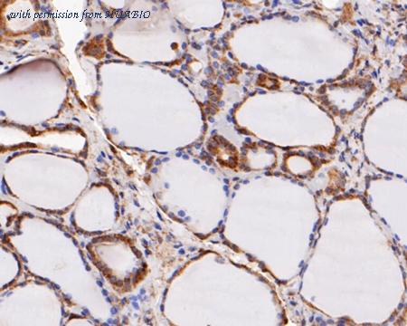 Immunohistochemical analysis of paraffin-embedded human thyroid tissue using anti-ERK2 antibody. The section was pre-treated using heat mediated antigen retrieval with sodium citrate buffer (pH 6.0) (high pressure) for 2 minutes. The tissues were blocked in 5% BSA for 30 minutes at room temperature, washed with ddH2O and PBS, and then probed with the primary antibody (EM1901-55, 1/100) for 30 minutes at room temperature. The detection was performed using an HRP conjugated compact polymer system. DAB was used as the chromogen. Tissues were counterstained with hematoxylin and mounted with DPX.