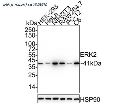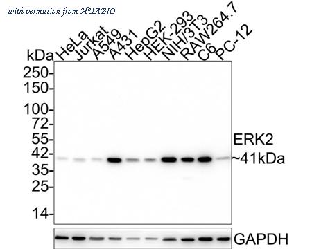 Western blot analysis of ERK2 on different lysates with Mouse anti-ERK2 antibody (HA601202) at 1/1,000 dilution. Lane 1: HeLa cell lysate (20 µg/Lane) Lane 2: Jurkat cell lysate (20 µg/Lane) Lane 3: A549 cell lysate (20 µg/Lane) Lane 4: A431 cell lysate (20 µg/Lane) Lane 5: HepG2 cell lysate (20 µg/Lane) Lane 6: HEK-293 cell lysate (20 µg/Lane) Lane 7: NIH/3T3 cell lysate (20 µg/Lane) Lane 8: RAW264.7 cell lysate (20 µg/Lane) Lane 9: C6 cell lysate (20 µg/Lane) Lane 10: PC-12 cell lysate (20 µg/Lane) Predicted band size: 41 kDa Observed band size: 41 kDa Exposure time: 3 minutes; 4-20% SDS-PAGE gel. Proteins were transferred to a PVDF membrane and blocked with 5% NFDM/TBST for 1 hour at room temperature. The primary antibody (HA601202) at 1/1,000 dilution was used in 5% NFDM/TBST at 4℃ overnight. Alpaca Anti-Mouse IgG - HRP for IP Nano-Secondary Antibody (NBI02H) at 1/5,000 dilution was used for 1 hour at room temperature.