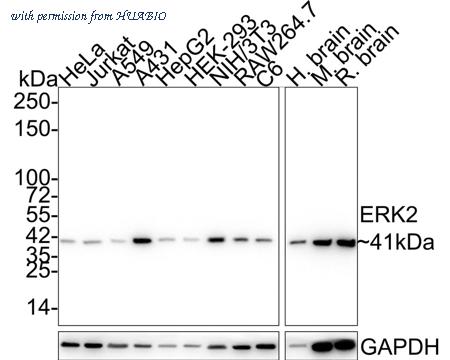 Western blot analysis of ERK2 on different lysates with Mouse anti-ERK2 antibody (HA610079) at 1/1,000 dilution. Lane 1: HeLa cell lysate (20 µg/Lane) Lane 2: Jurkat cell lysate (20 µg/Lane) Lane 3: A549 cell lysate (20 µg/Lane) Lane 4: A431 cell lysate (20 µg/Lane) Lane 5: HepG2 cell lysate (20 µg/Lane) Lane 6: HEK-293 cell lysate (20 µg/Lane) Lane 7: NIH/3T3 cell lysate (20 µg/Lane) Lane 8: RAW264.7 cell lysate (20 µg/Lane) Lane 9: C6 cell lysate (20 µg/Lane) Lane 10: Human brain tissue lysate (40 µg/Lane) Lane 11: Mouse brain tissue lysate (40 µg/Lane) Lane 12: Rat brain tissue lysate (40 µg/Lane) Predicted band size: 41 kDa Observed band size: 41 kDa Exposure time: 43 seconds; ECL: K1801; 4-20% SDS-PAGE gel. Proteins were transferred to a PVDF membrane and blocked with 5% NFDM/TBST for 1 hour at room temperature. The primary antibody (HA610079) at 1/1,000 dilution was used in 5% NFDM/TBST at 4℃ overnight. Alpaca Anti-Mouse IgG - HRP for IP Nano-Secondary Antibody (NBI02H) at 1/5,000 dilution was used for 1 hour at room temperature.
