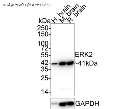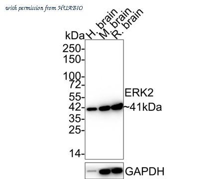 Western blot analysis of ERK2 on different lysates with Mouse anti-ERK2 antibody (HA610080) at 1/1,000 dilution. Lane 1: Human brain tissue lysate (40 µg/Lane) Lane 2: Mouse brain tissue lysate (40 µg/Lane) Lane 3: Rat brain tissue lysate (40 µg/Lane) Predicted band size: 41 kDa Observed band size: 41 kDa Exposure time: 1 minute 2 seconds; 4-20% SDS-PAGE gel. Proteins were transferred to a PVDF membrane and blocked with 5% NFDM/TBST for 1 hour at room temperature. The primary antibody (HA610080) at 1/1,000 dilution was used in 5% NFDM/TBST at 4℃ overnight. Alpaca Anti-Mouse IgG - HRP for IP Nano-Secondary Antibody (NBI02H) at 1/5,000 dilution was used for 1 hour at room temperature.