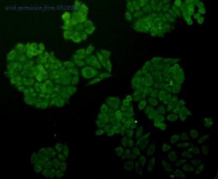ICC staining ERK2 in HepG2 cells (green). Formalin fixed cells were permeabilized with 0.1% Triton X-100 in TBS for 10 minutes at room temperature and blocked with 1% Blocker BSA for 15 minutes at room temperature. Cells were probed with ERK2 monoclonal antibody at a dilution of 1:100 for 1 hour at room temperature, washed with PBS. Alexa Fluorc™ 488 Goat anti-Mouse IgG was used as the secondary antibody at 1/100 dilution.