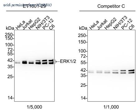Western blot analysis of ERK1/2 on different lysates with Rabbit anti-ERK1/2 antibody (ET1601-29) at 1/5,000 dilution and competitor's antibody at 1/1,000 dilution. Lane 1: HeLa cell lysate Lane 2: Jurkat cell lysate Lane 3: HepG2 cell lysate Lane 4: NIH/3T3 cell lysate Lane 5: PC-12 cell lysate Lane 6: C6 cell lysate Lysates/proteins at 15 µg/Lane. Predicted band size: 43/41 kDa Observed band size: 43/41 kDa Exposure time: 19 seconds; ECL: K1801; 4-20% SDS-PAGE gel. Proteins were transferred to a PVDF membrane and blocked with 5% NFDM/TBST for 1 hour at room temperature. The primary antibody (ET1601-29) at 1/5,000 dilution and competitor's antibody at 1/1,000 dilution were used in 5% NFDM/TBST at 4℃ overnight. Goat Anti-Rabbit IgG - HRP Secondary Antibody (HA1001) at 1/50,000 dilution was used for 1 hour at room temperature.