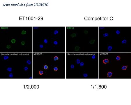 Immunocytochemistry analysis of Jurkat cells labeling ERK1/2 with Rabbit anti-ERK1/2 antibody (ET1601-29) at 1/2,000 dilution and competitor's antibody at 1/1,600 dilution. Cells were fixed in 4% paraformaldehyde for 20 minutes at room temperature, permeabilized with 0.1% Triton X-100 in PBS for 5 minutes at room temperature, then blocked with 1% BSA in 10% negative goat serum for 1 hour at room temperature. Cells were then incubated with Rabbit anti-ERK1/2 antibody (ET1601-29) at 1/2,000 dilution and competitor's antibody at 1/1,600 dilution in 1% BSA in PBST overnight at 4 ℃. Goat Anti-Rabbit IgG H&L (iFluor™ 488, HA1121) was used as the secondary antibody at 1/1,000 dilution. PBS instead of the primary antibody was used as the secondary antibody only control. Nuclear DNA was labelled in blue with DAPI. Beta tubulin (M1305-2, red) was stained at 1/100 dilution overnight at +4℃. Goat Anti-Mouse IgG H&L (iFluor™ 594, HA1126) was used as the secondary antibody at 1/1,000 dilution.