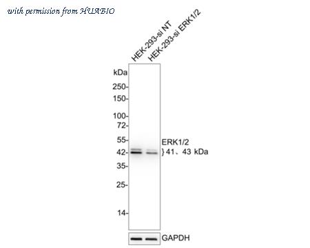 Western blot analysis of ERK1/2 on different lysates with Rabbit anti-ERK1/2 antibody (HA750019) at 1/5,000 dilution. Lane 1: HEK-293-si NT cell lysate Lane 2: HEK-293-si ERK1/2 cell lysate Lysates/proteins at 10 µg/Lane. Predicted band size: 41/43 kDa Observed band size: 41/43kDa Exposure time: 20 seconds; ECL: K1801; 4-20% SDS-PAGE gel. Proteins were transferred to a PVDF membrane and blocked with 5% NFDM in TBST for 1 hour at room temperature. The primary antibody (ET1601-29, 1/5,000) and Loading control antibody (Rabbit anti-GAPDH, ET1601-4, 1/10,000) were used in 5% NFDM/TBST at 4℃ overnight. Goat Anti-rabbit IgG-HRP Secondary Antibody (HA1001) at 1/50,000 dilution was used for 1 hour at room temperature.