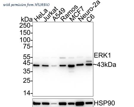 Western blot analysis of ERK1/2 on different lysates with Rabbit anti-ERK1/2 antibody (ER131011) at 1/2,000 dilution. Lane 1: HeLa cell lysate Lane 2: Jurkat cell lysate Lane 3: Ramos cell lysate Lane 4: MCF7 cell lysate Lane 5: Neuro-2a cell lysate Lane 6: C6 cell lysate Lysates/proteins at 20 µg/Lane. Predicted band size: 43/41 kDa Observed band size: 43/41 kDa Exposure time: 6 seconds; ECL: K1801; 4-20% SDS-PAGE gel. Proteins were transferred to a PVDF membrane and blocked with 5% NFDM/TBST for 1 hour at room temperature. The primary antibody (ER131011) at 1/2,000 dilution was used in 5% NFDM/TBST at 4℃ overnight. Goat Anti-Rabbit IgG - HRP Secondary Antibody (HA1001) at 1/50,000 dilution was used for 1 hour at room temperature.