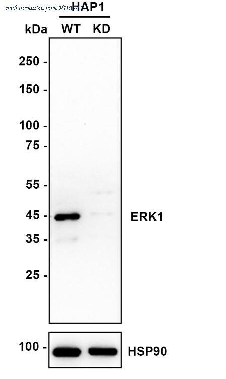 Western blot analysis of ERK1 on different lysates with Rabbit anti-ERK1 antibody (ET1604-16) at 1/5,000 dilution. Lane 1: HAP1-parental cell lysate Lane 2: HAP1-ERK1 KD cell lysate Lysates/proteins at 10 µg/Lane. Predicted band size: 43 kDa Observed band size: 43 kDa Exposure time: 2 minutes; ECL: K1801; 4-20% SDS-PAGE gel. Proteins were transferred to a PVDF membrane and blocked with 5% NFDM/TBST for 1 hour at room temperature. The primary antibody (ET1604-16) at 1/5,000 dilution was used in primary antibody dilution (K1803) at 4℃ overnight. Goat Anti-Rabbit IgG - HRP Secondary Antibody (HA1001) at 1/50,000 dilution was used for 1 hour at room temperature.