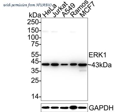 Western blot analysis of ERK1 on different lysates with Rabbit anti-ERK1 antibody (ET1604-32) at 1/1,000 dilution. Lane 1: HeLa cell lysate Lane 2: Jurkat cell lysate Lane 3: A549 cell lysate Lane 4: Ramos cell lysate Lane 5: MCF7 cell lysate Lysates/proteins at 20 µg/Lane. Predicted band size: 43 kDa Observed band size: 43 kDa Exposure time: 6 seconds; ECL: K1801; 4-20% SDS-PAGE gel. Proteins were transferred to a PVDF membrane and blocked with 5% NFDM/TBST for 1 hour at room temperature. The primary antibody (ET1604-32) at 1/1,000 dilution was used in 5% NFDM/TBST at 4℃ overnight. Goat Anti-Rabbit IgG - HRP Secondary Antibody (HA1001) at 1/50,000 dilution was used for 1 hour at room temperature.