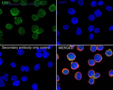 Immunocytochemistry analysis of Jurkat cells labeling ERK1 with Rabbit anti-ERK1 antibody (ET1604-32) at 1/100 dilution. Cells were fixed in 4% paraformaldehyde for 15 minutes at room temperature, permeabilized with 0.1% Triton X-100 in PBS for 15 minutes at room temperature, then blocked with 1% BSA in 10% negative goat serum for 1 hour at room temperature. Cells were then incubated with Rabbit anti-ERK1 antibody (ET1604-32) at 1/100 dilution in 1% BSA in PBST overnight at 4 ℃. Goat Anti-Rabbit IgG H&L (iFluor™ 488, HA1121) was used as the secondary antibody at 1/1,000 dilution. PBS instead of the primary antibody was used as the secondary antibody only control. Nuclear DNA was labelled in blue with DAPI. Beta tubulin (HA601187, red) was stained at 1/100 dilution overnight at +4℃. Goat Anti-Mouse IgG H&L (iFluor™ 594, HA1126) was used as the secondary antibody at 1/1,000 dilution.