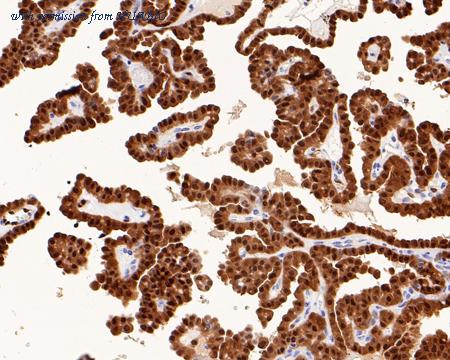 Immunohistochemical analysis of paraffin-embedded human thyroid carcinoma tissue with Rabbit anti-Phospho-Erk1 (T202 + Y204) + Erk2 (T185 + Y187) antibody (ET1610-13) at 1/1,000 dilution. The section was pre-treated using heat mediated antigen retrieval with sodium citrate buffer (pH 6.0) (high pressure) for 2 minutes. The tissues were blocked in 1% BSA for 20 minutes at room temperature, washed with ddH2O and PBS, and then probed with the primary antibody (ET1610-13) at 1/1,000 dilution for 1 hour at room temperature. The detection was performed using an HRP conjugated compact polymer system. DAB was used as the chromogen. Tissues were counterstained with hematoxylin and mounted with DPX.