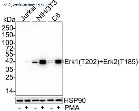Western blot analysis of Phospho-Erk1 (T202)+Erk2 (T185) on different lysates with Rabbit anti-Phospho-Erk1 (T202)+Erk2 (T185) antibody (HA750061) at 1/1,000 dilution. Lane 1: Jurkat cell lysate Lane 2: Jurkat treated with 200ng/mL PMA for 35 minutes cell lysate Lane 3: NIH/3T3 cell lysate Lane 4: NIH/3T3 treated with 200nM PMA for 30 minutes cell lysate Lane 5: C6 cell lysate Lane 6: C6 treated with 200nM PMA for 30 minutes cell lysate Lysates/proteins at 10 µg/Lane. Predicted band size: 41/43 kDa Observed band size: 41/43 kDa Exposure time: 3 minutes; ECL: K1802; 4-20% SDS-PAGE gel. Proteins were transferred to a PVDF membrane and blocked with 5% NFDM/TBST for 1 hour at room temperature. The primary antibody (HA750061) at 1/1,000 dilution was used in 5% NFDM/TBST at 4℃ overnight. Goat Anti-Rabbit IgG - HRP Secondary Antibody (HA1001) at 1/50,000 dilution was used for 1 hour at room temperature.