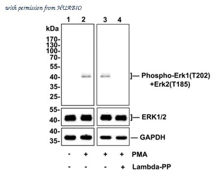Western blot analysis of Phospho-Erk1(T202)+Erk2(T185) on jurkat cell lysates. Lane 1: jurkat cells, whole cell lysate, 10ug/lane Lane 2/3: jurkat cells treated with 200 ng/ml PMA for 35 minutes, whole cell lysate, 10ug/lane Lane 4: jurkat cells treated with 200 ng/ml PMA for 35 minutes, then treated with 2.8ug/ul lambda-PP for 30 minutes, whole cell lysates, 10ug/lane All lanes : Anti-Phospho-Erk1(T202)+Erk2(T185) antibody (HA750061) at 1/500 dilution. Anti-Erk1+Erk2antibody (ET1601-29) at 1/500 dilution. Anti-GAPDH antibody (ET1601-4) at 1/10,000 dilution. Goat Anti-Rabbit IgG H&L (HRP) (HA1001) at 1/200,000 dilution. Predicted band size: 41/43 kDa Observed band size: 41/43 kDa Blocking and diluting buffer: 5% BSA. Exposure time: Lan1/2 4 minutes; Lan3/4 3 minutes