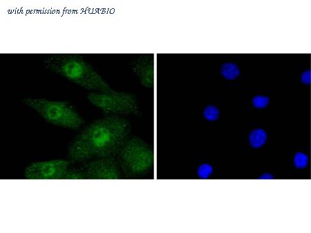 ICC staining of Phospho-Erk1 (T202)+Erk2 (T185) in A549 cells (green). Formalin fixed cells were permeabilized with 0.1% Triton X-100 in TBS for 10 minutes at room temperature and blocked with 1% Blocker BSA for 15 minutes at room temperature. Cells were probed with the primary antibody (HA750061, 1/50) for 1 hour at room temperature, washed with PBS. Alexa Fluor®488 Goat anti-Rabbit IgG was used as the secondary antibody at 1/1,000 dilution. The nuclear counter stain is DAPI (blue).