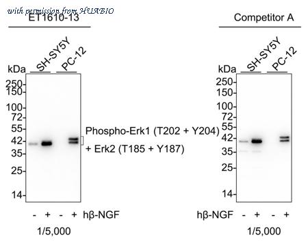 Western blot analysis of Phospho-Erk1 (T202 + Y204) + Erk2 (T185 + Y187) on different lysates with Rabbit anti-Phospho-Erk1 (T202 + Y204) + Erk2 (T185 + Y187) antibody (ET1610-13) at 1/5,000 dilution and competitor's antibody at 1/5,000 dilution. Lane 1: SH-SY5Y cell lysate Lane 2: SH-SY5Y treated with 100ng/mL hβ-NGF for 10 minutes cell lysate Lane 3: PC-12 cell lysate Lane 4: PC-12 treated with 100ng/mL hβ-NGF for 10 minutes cell lysate Lysates/proteins at 15 µg/Lane. Predicted band size: 41/43 kDa Observed band size: 41/43 kDa Exposure time: 1 minute 50 seconds; ECL: K1801; 4-20% SDS-PAGE gel. Proteins were transferred to a PVDF membrane and blocked with 5% NFDM/TBST for 1 hour at room temperature. The primary antibody (ET1610-13) at 1/5,000 dilution and competitor's antibody at 1/5,000 dilution were used in 5% BSA at 4℃ overnight. Goat Anti-Rabbit IgG - HRP Secondary Antibody (HA1001) at 1/50,000 dilution was used for 1 hour at room temperature.