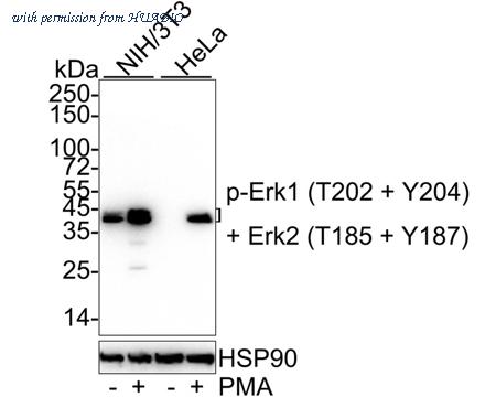 Western blot analysis of Phospho-Erk1 (T202 + Y204) + Erk2 (T185 + Y187) on different lysates with Rabbit anti-Phospho-Erk1 (T202 + Y204) + Erk2 (T185 + Y187) antibody (HA750199) at 1/5,000 dilution. Lane 1: NIH/3T3 cell lysate Lane 2: NIH/3T3 treated with 200nM PMA for 30 minutes cell lysate Lane 3: HeLa cell lysate Lane 4: HeLa treated with 200nM PMA for 30 minutes cell lysate Lysates/proteins at 20 µg/Lane. Predicted band size: 41/43 kDa Observed band size: 41/43 kDa Exposure time: 13 seconds; ECL: K1801; 4-20% SDS-PAGE gel. Proteins were transferred to a PVDF membrane and blocked with 5% NFDM/TBST for 1 hour at room temperature. The primary antibody (HA750199) at 1/5,000 dilution was used in 5% NFDM/TBST at 4℃ overnight. Goat Anti-Rabbit IgG - HRP Secondary Antibody (HA1001) at 1/50,000 dilution was used for 1 hour at room temperature.