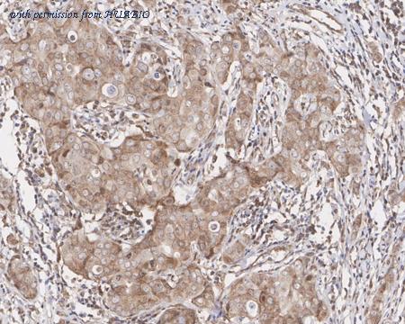 Immunohistochemical analysis of paraffin-embedded human breast carcinoma tissue with Mouse anti-ERK1 antibody (M1505-9) at 1/3,000 dilution. The section was pre-treated using heat mediated antigen retrieval with sodium citrate buffer (pH 6.0) (high pressure) for 2 minutes. The tissues were blocked in 1% BSA for 20 minutes at room temperature, washed with ddH2O and PBS, and then probed with the primary antibody (M1505-9) at 1/3,000 dilution for 1 hour at room temperature. The detection was performed using an HRP conjugated compact polymer system. DAB was used as the chromogen. Tissues were counterstained with hematoxylin and mounted with DPX.