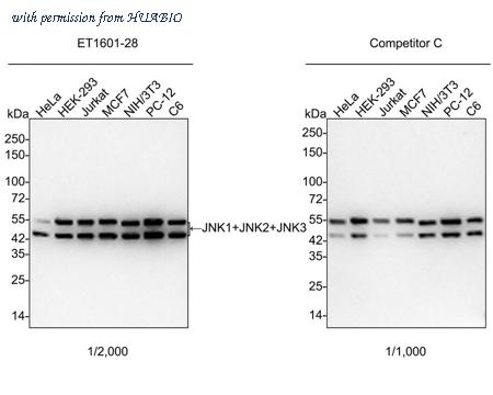 Western blot analysis of JNK1+JNK2+JNK3 on different lysates with Rabbit anti-JNK1+JNK2+JNK3 antibody (ET1601-28) at 1/2,000 dilution and competitor's antibody at 1/1,000 dilution. Lane 1: HeLa cell lysate Lane 2: HEK-293 cell lysate Lane 3: Jurkat cell lysate Lane 4: MCF7 cell lysate Lane 5: NIH/3T3 cell lysate Lane 6: PC-12 cell lysate Lane 7: C6 cell lysate Lysates/proteins at 15 µg/Lane. Predicted band size: 48/53 kDa Observed band size: 48/53 kDa Exposure time: 35 seconds; ECL: K1801; 4-20% SDS-PAGE gel. Proteins were transferred to a PVDF membrane and blocked with 5% NFDM/TBST for 1 hour at room temperature. The primary antibody (ET1601-28) at 1/2,000 dilution and competitor's antibody at 1/1,000 dilution were used in 5% NFDM/TBST at 4℃ overnight. Goat Anti-Rabbit IgG - HRP Secondary Antibody (HA1001) at 1/50,000 dilution was used for 1 hour at room temperature.