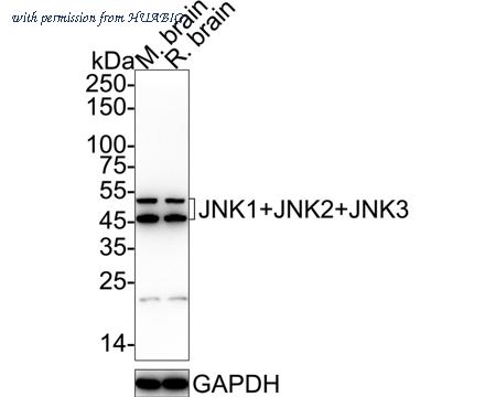 Western blot analysis of JNK1+JNK2+JNK3 on different lysates with Rabbit anti-JNK1+JNK2+JNK3 antibody (HA750018) at 1/5,000 dilution. Lane 1: Mouse brain tissue lysate (15 µg/Lane) Lane 2: Rat brain tissue lysate (15 µg/Lane) Predicted band size: 48/53 kDa Observed band size: 48/53 kDa Exposure time: 1 minute; ECL: K1801; 4-20% SDS-PAGE gel. Proteins were transferred to a PVDF membrane and blocked with 5% NFDM/TBST for 1 hour at room temperature. The primary antibody (HA750018) at 1/5,000 dilution was used in 5% BSA at 4℃ overnight. Goat Anti-Rabbit IgG - HRP Secondary Antibody (HA1001) at 1/50,000 dilution was used for 1 hour at room temperature.