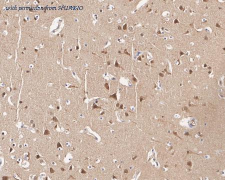 Immunohistochemical analysis of paraffin-embedded human brain tissue with Rabbit anti-JNK1+JNK2+JNK3 antibody (HA750018) at 1/1,000 dilution. The section was pre-treated using heat mediated antigen retrieval with sodium citrate buffer (pH 6.0) (high pressure) for 2 minutes. The tissues were blocked in 1% BSA for 20 minutes at room temperature, washed with ddH2O and PBS, and then probed with the primary antibody (HA750018) at 1/1,000 dilution for 1 hour at room temperature. The detection was performed using an HRP conjugated compact polymer system. DAB was used as the chromogen. Tissues were counterstained with hematoxylin and mounted with DPX.