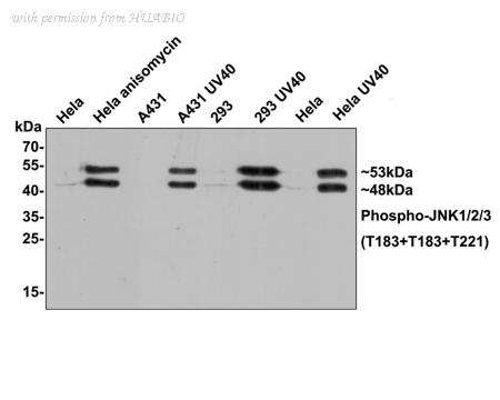 Western blot analysis of Phospho-JNK1/2/3 (T183 + T183 + T221) on different lysates with Rabbit anti-Phospho-JNK1/2/3 (T183 + T183 + T221) antibody (HA750173) at 1/1,000 dilution. Lane 1: Hela cell lysate, untreated (10 µg/Lane) Lane 2: Hela cell lysate, treated with Anisomycin (10 µg/Lane) Lane 3: A431 cell lysate, untreated (10 µg/Lane) Lane 4: A431 cell lysate, treated with UV40 (10 µg/Lane) Lane 5: 293 cell lysate, untreated (10 µg/Lane) Lane 6: 293 cell lysate, treated with UV40 (10 µg/Lane) Lane 7: Hela cell lysate, untreated (10 µg/Lane) Lane 8: Hela cell lysate, treated with UV40 (10 µg/Lane) Predicted band size: 48/53 kDa Observed band size: 48/53 kDa Exposure time: 2 minutes; 12% SDS-PAGE gel. Proteins were transferred to a PVDF membrane and blocked with 5% NFDM/TBST for 1 hour at room temperature. The primary antibody (HA750173) at 1/1,000 dilution was used in 5% NFDM/TBST at room temperature for 2 hours. Goat Anti-Rabbit IgG - HRP Secondary Antibody (HA1001) at 1:300,000 dilution was used for 1 hour at room temperature.