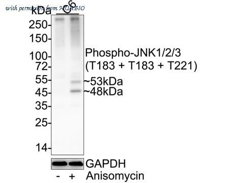 Western blot analysis of Phospho-JNK1/2/3 (T183 + T183 + T221) on different lysates with Rabbit anti-Phospho-JNK1/2/3 (T183 + T183 + T221) antibody (HA750173) at 1/2,000 dilution. Lane 1: C6 cell lysate Lane 2: C6 treated with 25µg/mL Anisomycin for 30 minutes cell lysate. Lysates/proteins at 20 µg/Lane. Predicted band size: 48/53 kDa Observed band size: 48/53 kDa Exposure time: 2 minutes 6 seconds; ECL: K1802; 4-20% SDS-PAGE gel. Proteins were transferred to a PVDF membrane and blocked with 5% NFDM/TBST for 1 hour at room temperature. The primary antibody (HA750173) at 1/2,000 dilution was used in 5% NFDM/TBST at 4℃ overnight. Goat Anti-Rabbit IgG - HRP Secondary Antibody (HA1001) at 1/50,000 dilution was used for 1 hour at room temperature.