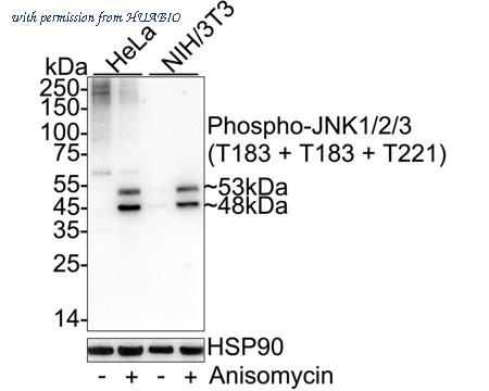 Western blot analysis of Phospho-JNK1/2/3 (T183 + T183 + T221) on different lysates with Rabbit anti-Phospho-JNK1/2/3 (T183 + T183 + T221) antibody (HA750173) at 1/2,000 dilution. Lane 1: HeLa cell lysate Lane 2: HeLa treated with 25μg/mL Anisomycin for 30 minutes cell lysate Lane 3: NIH/3T3 cell lysate Lane 4: NIH/3T3 treated with 25μg/mL Anisomycin for 30 minutes cell lysate Lysates/proteins at 20 µg/Lane. Predicted band size: 48/53 kDa Observed band size: 48/53 kDa Exposure time: 59 seconds; ECL: K1801; 4-20% SDS-PAGE gel. Proteins were transferred to a PVDF membrane and blocked with 5% NFDM/TBST for 1 hour at room temperature. The primary antibody (HA750173) at 1/2,000 dilution was used in 5% NFDM/TBST at 4℃ overnight. Goat Anti-Rabbit IgG - HRP Secondary Antibody (HA1001) at 1/50,000 dilution was used for 1 hour at room temperature.