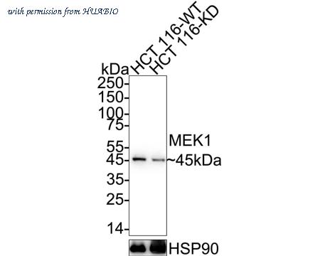 Western blot analysis of MEK1 on different lysates with Rabbit anti-MEK1 antibody (ET1603-20) at 1/2,000 dilution. Lane 1: HCT 116-si NT cell lysate Lane 2: HCT 116-si MEK1 cell lysate Lysates/proteins at 10 µg/Lane. Predicted band size: 43 kDa Observed band size: 45 kDa Exposure time: 8 seconds; ECL: K1801; 4-20% SDS-PAGE gel. Proteins were transferred to a PVDF membrane and blocked with 5% NFDM/TBST for 1 hour at room temperature. The primary antibody (ET1603-20) at 1/2,000 dilution was used in 5% NFDM/TBST at 4℃ overnight. Goat Anti-Rabbit IgG - HRP Secondary Antibody (HA1001) at 1/50,000 dilution was used for 1 hour at room temperature.