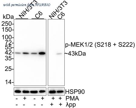 Western blot analysis of Phospho-MEK1/2 (S218 + S222) on different lysates with Rabbit anti-Phospho-MEK1/2 (S218 + S222) antibody (ET1609-50) at 1/1,000 dilution. Lane 1: NIH/3T3 cell lysate Lane 2: NIH/3T3 treated with 200nM PMA for 30 minutes cell lysate Lane 3: C6 cell lysate Lane 4: C6 treated with 200nM PMA for 30 minutes cell lysate Lane 5: NIH/3T3 treated with 200nM PMA for 30 minutes cell lysate, then the membrane treated with λpp for 1 hour Lane 6: C6 treated with 200nM PMA for 30 minutes cell lysate, then the membrane treated with λpp for 1 hour Lysates/proteins at 20 µg/Lane. Predicted band size: 43 kDa Observed band size: 43 kDa Exposure time: 24 seconds; 4-20% SDS-PAGE gel. Proteins were transferred to a PVDF membrane and blocked with 5% NFDM/TBST for 1 hour at room temperature. The primary antibody (ET1609-50) at 1/1,000 dilution was used in 5% NFDM/TBST at 4℃ overnight. Goat Anti-Rabbit IgG - HRP Secondary Antibody (HA1001) at 1/50,000 dilution was used for 1 hour at room temperature.