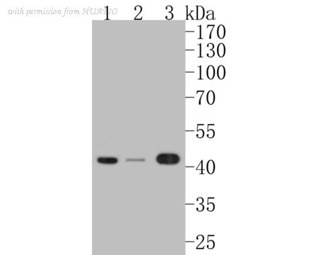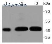 Western blot analysis of Phospho-MEK1 (S298) on different lysates. Proteins were transferred to a PVDF membrane and blocked with 5% BSA in PBS for 1 hour at room temperature. The primary antibody (ET1612-40, 1/500) was used in 5% BSA at room temperature for 2 hours. Goat Anti-Rabbit IgG - HRP Secondary Antibody (HA1001) at 1:200,000 dilution was used for 1 hour at room temperature. Positive control: Lane 1: Hela cell lysate Lane 2: NIH/3T3 cell lysate Lane 3: A431 cell lysate