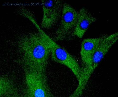 ICC staining of MEK1/2 in NIH/3T3 cells (green). Formalin fixed cells were permeabilized with 0.1% Triton X-100 in TBS for 10 minutes at room temperature and blocked with 1% Blocker BSA for 15 minutes at room temperature. Cells were probed with the primary antibody (HA750042, 1/50) for 1 hour at room temperature, washed with PBS. Alexa Fluor®488 Goat anti-Rabbit IgG was used as the secondary antibody at 1/1,000 dilution. The nuclear counter stain is DAPI (blue).