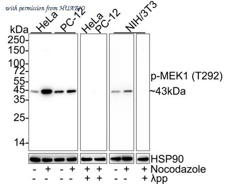 Western blot analysis of Phospho-MEK1 (T292) on different lysates with Rabbit anti-Phospho-MEK1 (T292) antibody (ET1612-42) at 1/1,000 dilution. Lane 1: HeLa cell lysate Lane 2: HeLa treated with 100ng/mL Nocodazole for 17 hours cell lysate Lane 3: PC-12 cell lysate Lane 4: PC-12 treated with 100ng/mL Nocodazole for 18 hours cell lysate Lane 5: HeLa treated with 100ng/mL Nocodazole for 17 hours cell lysate, then the membrane treated with λpp for 1 hour Lane 6: PC-12 treated with 100ng/mL Nocodazole for 18 hours cell lysate, then the membrane treated with λpp for 1 hour Lane 7: NIH/3T3 cell lysate Lane 8: NIH/3T3 treated with 100ng/mL Nocodazole for 18 hours cell lysate Lane 9: NIH/3T3 treated with 100ng/mL Nocodazole for 18 hours cell lysate, then the membrane treated with λpp for 1 hour Lysates/proteins at 20 µg/Lane. Predicted band size: 43 kDa Observed band size: 43 kDa Exposure time: 3 minutes; ECL: K1801; 4-20% SDS-PAGE gel. Proteins were transferred to a PVDF membrane and blocked with 5% NFDM/TBST for 1 hour at room temperature. The primary antibody (ET1612-42) at 1/1,000 dilution was used in 5% NFDM/TBST at 4℃ overnight. Goat Anti-Rabbit IgG - HRP Secondary Antibody (HA1001) at 1/50,000 dilution was used for 1 hour at room temperature.