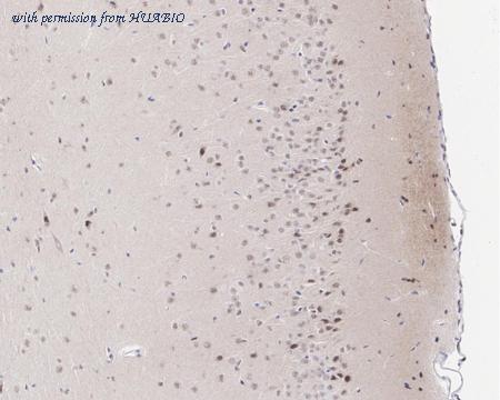 Immunohistochemical analysis of paraffin-embedded mouse brain tissue with Rabbit anti-Phospho-MEK1 (T292) antibody (ET1612-42) at 1/200 dilution. The section was pre-treated using heat mediated antigen retrieval with Tris-EDTA buffer (pH 9.0) for 20 minutes. The tissues were blocked in 1% BSA for 20 minutes at room temperature, washed with ddH2O and PBS, and then probed with the primary antibody (ET1612-42) at 1/200 dilution for 1 hour at room temperature. The detection was performed using an HRP conjugated compact polymer system. DAB was used as the chromogen. Tissues were counterstained with hematoxylin and mounted with DPX.