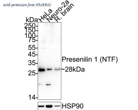 Western blot analysis of Presenilin 1 / PS-1 on different lysates with Rabbit anti-Presenilin 1 / PS-1 antibody (ER1915-40) at 1/2,000 dilution. Lane 1: HeLa cell lysate Lane 2: Neuro-2a cell lysate Lane 3: Rat brain tissue lysate Lysates/proteins at 15 µg/Lane. Predicted band size: 53 kDa Observed band size: 28 kDa Exposure time: 1 minute; ECL: K1801; 4-20% SDS-PAGE gel. Proteins were transferred to a PVDF membrane and blocked with 5% NFDM/TBST for 1 hour at room temperature. The primary antibody (ER1915-40) at 1/2,000 dilution was used in 5% NFDM/TBST at 4℃ overnight. Goat Anti-Rabbit IgG - HRP Secondary Antibody (HA1001) at 1/50,000 dilution was used for 1 hour at room temperature.