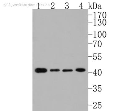 Western blot analysis of Presenilin 1 / PS-1 on different lysates. Proteins were transferred to a PVDF membrane and blocked with 5% BSA in PBS for 1 hour at room temperature. The primary antibody (HA500219, 1/1,000) was used in 5% BSA at room temperature for 2 hours. Goat Anti-Rabbit IgG - HRP Secondary Antibody (HA1001) at 1:200,000 dilution was used for 1 hour at room temperature. Positive control: Lane 1: NIH/3T3 cell lysate Lane 2: Raji cell lysate Lane 3: MCF-7 cell lysate Lane 4: Daudi cell lysate